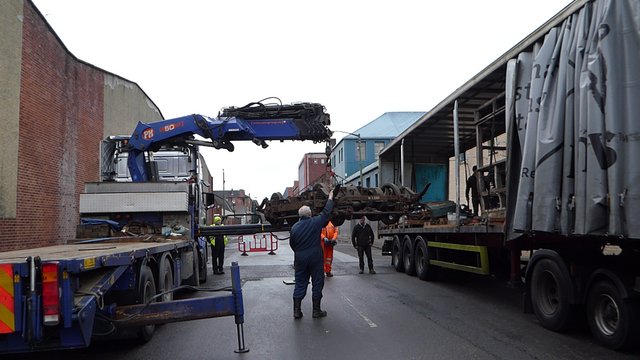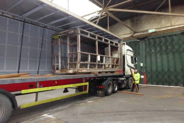 Now loaded up ready for its road journey, this view of the surviving body shows how much work will be involved in restoring 1016 in the future.