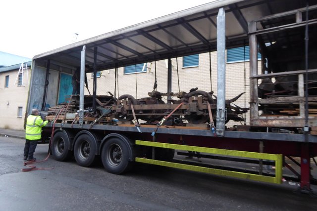 All the parts of the tram are now seen loaded up ready to leave Glasgow. The truck can clearly be seen in the middle of the lorry trailer, whilst the saloon frame can be seen on the right hand side of the image. (All photos by Stuart Little, courtesy of SITA)