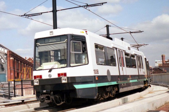 1008 had been in Manchester since 28th December 1991 with it being one of the two trams to inmagurate services on 6th April 1992 from Bury to Victoria when it was coupled to 1004. Its fame increased on the day these photos were taken as it broke the banner on High Street at 1100 to formally open the city centre Metrolink lines (it was then used for a special tour for dignitaries to G-Mex and back to Victoria). Then when services started to Altrincham on 15th June 1008 formed the first service from Victoria to Altrincham. 1008 continued in service until 13th June 2012 when it became the third of the class to be withdrawn and it then remained in Manchester until 16th May 2014 when it departed for Rotherham and scrapping.