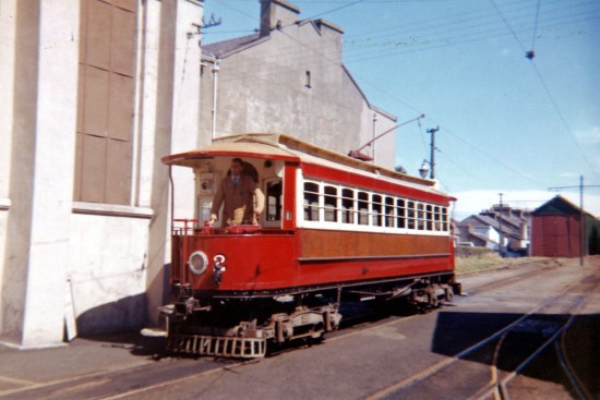 This photo was taken in August 1963 and shows no. 2 presumably during a shunting move (as there are no passengers on board the tram) at Ramsey. The tram was carrying a fairly plain but traditional livery of Red, Teak and White at this time as seen in this view.