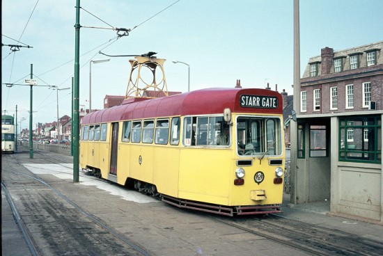 Thank you for posting this picture, it brought back a lot of memories. These trams (rebuilt from earlier railcoaches) were featured in a lengthy BBC Look North report at the time (1972-3). We were regular visitors to Blackpool then and wanted to go and take a ride. The novel aspect featuring in the Look North report was of the controller having to be used by the motorman’s right hand rather than his left and a motorman so trained was interviewed. (In another BBC Look North report from the 70s, a motorman was interviewed whilst driving one of these cars and he played Joe Loss 78s on a portable wind-up gramophone as the tram went down the prom, much to the delight of his passengers!). We boarded the car at Harrowside and the platform was wide and sloping rather like some of the Manchester buses in the 1960s, and of course, we paid the motorman. However, although the livery (plum and primrose – originally the colours of Rochdale Corporation and Middleton Electric Traction Co.), front aspect and the platform were all really most appealing, that was more or less all there was to recommend them. Once inside, we sat down on what must have been the most uncomfortable seats ever used in public transport – fixed (without moveable backs) and the backs themselves were at 90 degrees. They were phenomenally uncomfortable making you sit bolt upright and really unpleasant to ride any distance. Worse than that, the windows were much smaller and higher than the bodies they replaced and it was a strain to keep one’s head up to see out. Visiting Blackpool subsequently, we were not the only ones wishing that the railcoaches had been restored and more often than not, we let these one-man trams pass, waiting for a more comfortable ride. They finished up arching their backs like threatened cats and became really unpleasant, looking even worse in green and cream. The last time I travelled in one was in the later 1980s when it was noisy and depressingly slow. As I got off it and watched it disappear in the distance, I realised that it had been a bold and brave experiment which had been executed in the most reasonable manner for the time (apart from the seating which I still regard as an absolute failure). However, whereas the original railcoach had been a classic, these became just interesting birds of passage.
