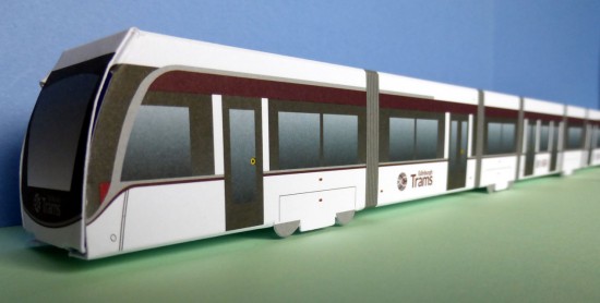 Edinburgh Trams have recently produced a cardboard press-out model of a tram which is available for free to anyone who visits the Transport for Edinburgh Travelshop at Haymarket Although not particularly detailed – it is cardboard and free after all – it is a nice little freebie and is approximately 1:100 scale. John Hampton has collected his freebie and provides us with the below image of the completed model.