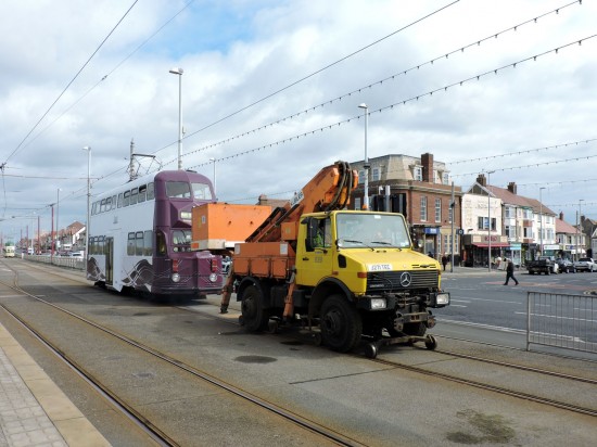 The Easter weekend saw another period of Gold heritage tram operation in Blackpool although not everything quite went according to plan. On Easter Monday, 17th April, B fleet Balloon 719 was allocated to operate the first northbound service of the day to Bispham but unfortunately on arrival at Bispham it was declared a failure and had to be towed back to Rigby Road Depot by Unimog 939. Mervyn Williams was on hand to capture these images.
