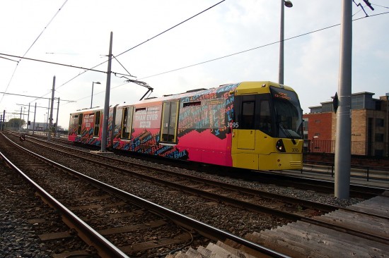 The number of non-standard liveries on Manchester Metrolink has declined again of late with only one tram having been carrying a vinyl wrap advert, 3095. This tram was advertising Raytheon Software Engineers in a rather dark livery but this week these vinyls have been replaced by some which, shall we say, are a bit on the brighter side! The latest sponsor of the tram is Key 103, a local radio station, with the base colour this time being pink. Once again the ends of the tram are left free with the extensive use of contravision on the remainder of the tram.