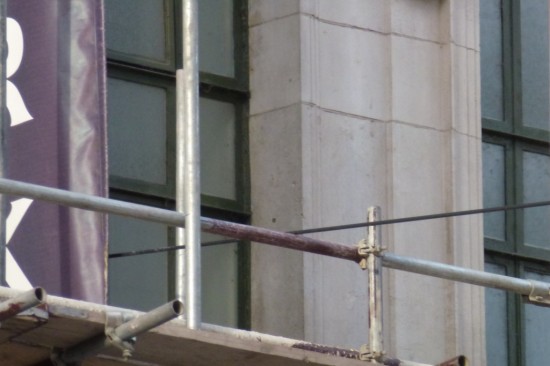 It is believed that at least one pull off rope near the Market Street curve was damaged probably due to the proximity of the erected scaffolding which, as the photo provided below shows, was rather close to some of these.