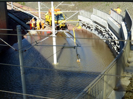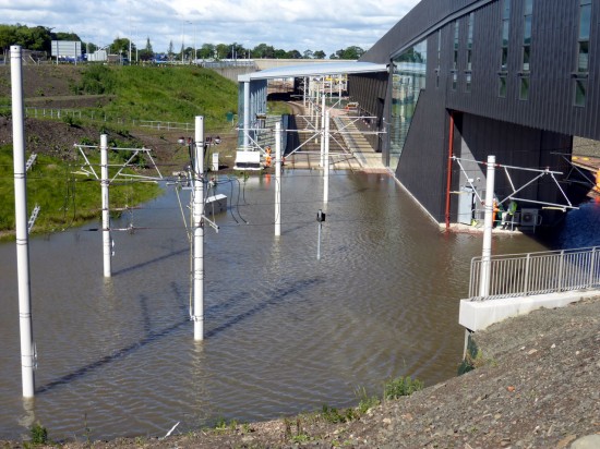 Edinburgh received about a month’s rainfall on Tuesday 6th June with Edinburgh Gateway tramstop being flooded preventing trams from passing through the area. Since the depot access tracks were also flooded at this point it was impossible to get the trams into the depot at the end of operation on Tuesday with trams on the city side of Edinburgh Gateway tramstop having to be stabled overnight at tram stops along the route. This did enable a service to be run on Wednesday 7th June but trams were only able to run between York Place and Edinburgh Park Station tramstop. At the time of writing it is not known when a full service will resume as Edinburgh Trams are waiting to see what damage has been caused by the flood waters once they have subsided.