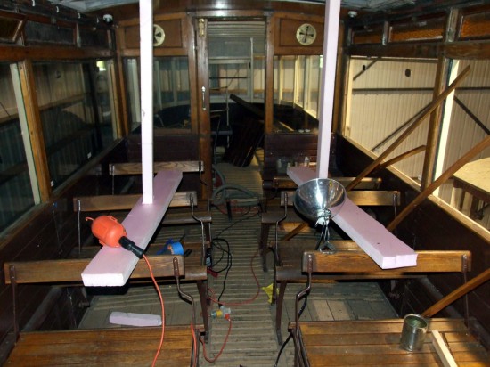 48 is currently at the back of the car barn where its overhaul work is being progressed. In this view the obvious attention has been turned towards the roof as evidenced by the ladder leaning against the side of the tram.