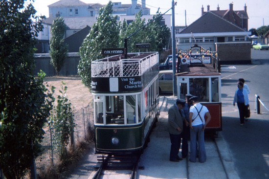 This view is taken at Seaton terminus from the top deck of another tram in August 1976 with tram crews looking as if they are discussing their next moves.
