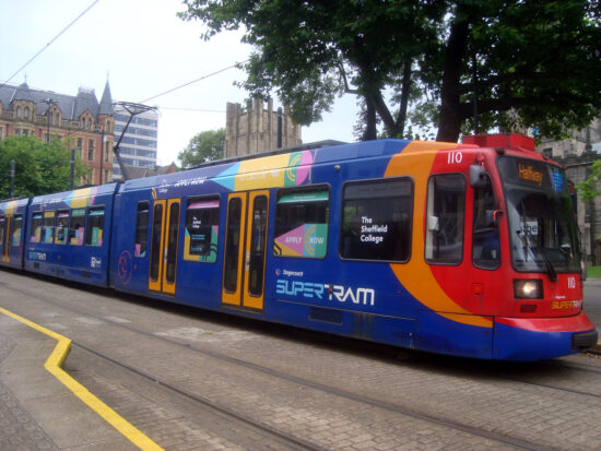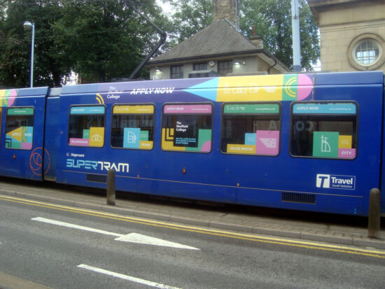 Stagecoach Supertram 110 has received some new adverts for Sheffield College whilst still retaining full fleet livery. The adverts consist of standard roof level adverts as seen on many of the trams in Sheffield with the addition of vinyls on the windows although not covering the full window.