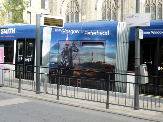 Continuing the standard design of roof level adverts and full height adverts on the third and fifth sections, with one of these adverts featuring sights of Scotland, the areas featured on these latest trams are: