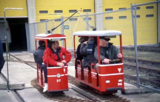A 7 ¼” portable layout the Wootton Electric Tramway has been a familiar sight at various locations around the south east of England at special events especially at the London Transport Museum’s Acton store and the Festival of Model Tramways proving to be very popular with children and adults alike. This view was taken on 8th March 2003 at an open day at Acton and shows two trams at a passing loop on the line nos. 27 and 96. Note also that the layout has overhead.