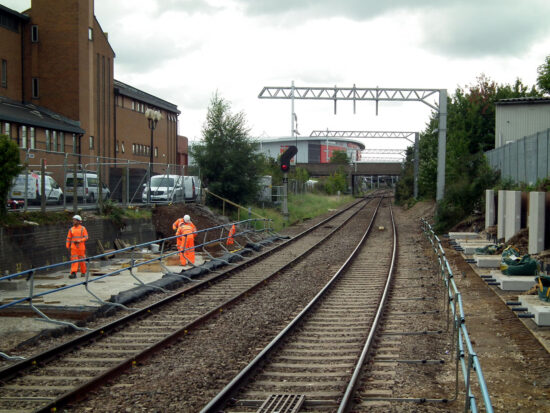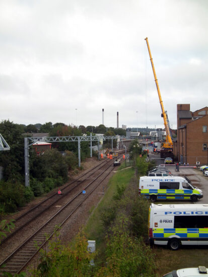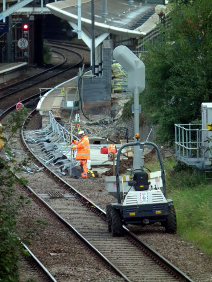 A full day engineering possession at Rotherham Central on Sunday 17th September 2017 allowed some work to be undertaken on construction of the station’s outbound low level tram-train platform, as seen in this view looking north from Main Street bridge.