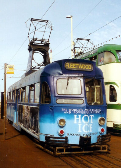 In these views we see 621 in its final all over advert for Hot Ice in 2003. This first image is at Starr Gate and shows the tram preparing to depart with a full length trip to Fleetwood on 12th September 2003. Note that the advertising vinyls are missing from this end of the tram following the replacement of panels.