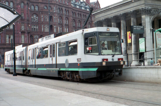 This photo shows 1023 at the original St Peter’s Square stop arriving on 6th September 1993 with an Altrincham to Bury service as a dog watches on.