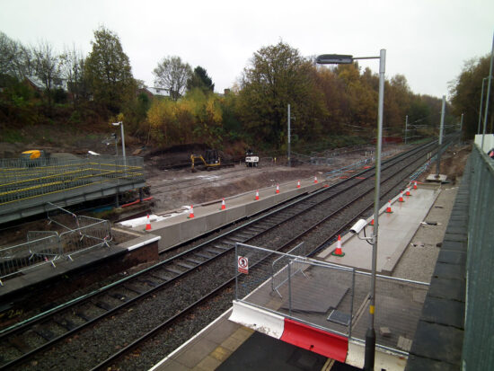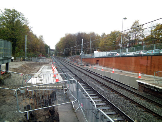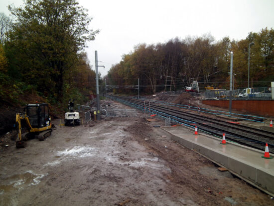 View at the south end of the new Manchester bound platform ramp showing the location where the additional turn back track for Trafford Park line services will be installed.