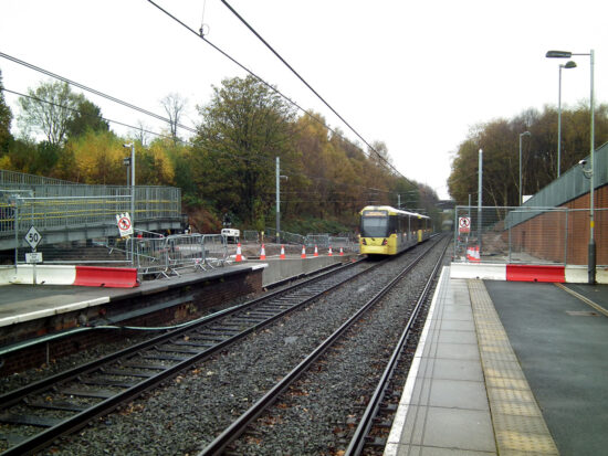Taken at the south end of the Bury bound platform this view shows the newly constructed pedestrian ramps, as 3032 (leading) & 3035 resume their Altrincham bound journey.