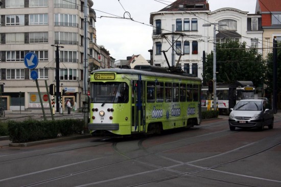 Gent 39 is a PCC tram and was one of 54 trams built in La Brugeoise with this particular example being completed in 1972. Gent is a metre gauge line and we see 39 turning into the loop outside St Pieters station – the main station for Gent although it is quite a way from the city centre. The tram was seen as it was working route 21 to Zwijnaardebrugge. The date of the photo is 4th September 2007 at a time when 39 was carrying an all over advert.