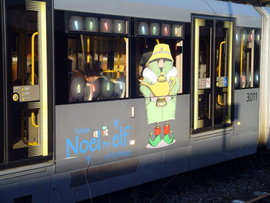 As has become traditional Manchester Metrolink have added vinyls to a few of their trams to celebrate Christmas. 3011, 3025 and 3032 are amongst the trams which have received the vinyls which feature Noel the elf along with some “lights” added to the windows. Photos from Dave Elison show the temporary vinyls.