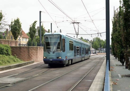 This is 812 which is leaving the northern terminus at Boulingren with a service for St Georges Braque. The two route system of standard gauge runs mainly in tunnel from Boulingren through the city centre before coming to the surface and then splitting into two branches mainly on reserved right of way. This tram is of the so-called Grenoble type and was part of batch built by Alstom in 1993-4. The date is 7th September 2001.