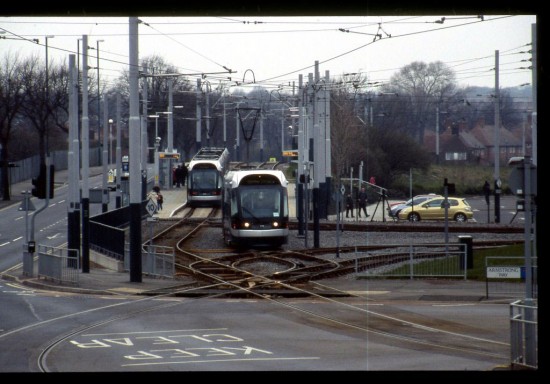 The location of this photo is Wilkinson Street and as well as two of the Bombardier built Incentro trams we can see the complex trackwork leading to and from the depot in the foreground. 211 is seen approaching the camera – and about to traverse the already mentioned trackwork – with a service which will run through to the then terminus at Station Street. It will take the left hand track as we look at the photo with trams heading out of the city using the right hand track through the single loop going through the Hyson Green area. We can also see another tram – unidentified – at the platform. Both trams carry the original fleet livery. This scene was captured on 23rd March 2007.