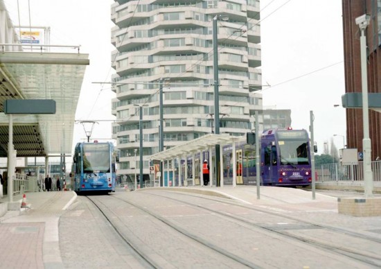 With the first lines not due to open for a couple of months it seems strange to see East Croydon so deserted (nowadays there is almost no chance of getting a photo here without people getting in the way) but that is the case on 31st March 2000 with trams in the two outer platforms as they both perform test runs. On the left heading out of Croydon we see 2546 in an all over advert for the Whitgift Shopping Centre which had been applied to the tram back in November 1999 – well before operations began. Then on the far side is 2531 which features an advert for Addington Palace, an advert which had been applied during January 2000. It was not to be until May that the first passengers were carried on the network.