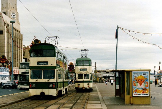These two trams are Jubilee 762 and Balloon 712 which are seen at the Victoria Street stop with both running to the respective end of the line. On the right 762 us running through to Starr Gate whilst 712 is just approaching the stop bound for Fleetwood.