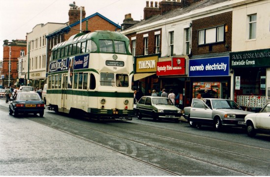 This view shows 713 at the start of a southbound journey as it runs along Lord Street, Fleetwood with a service to Pleasure Beach. This image was taken in 1987 at a time when 713 retained its trolley (pantograph operation was still four years away) and it has a T side advert for the Cannon and Ball show at the Opera House, at a time when comedy stars of the day could pack out the 3,000 seat auditorium for a full summer season.