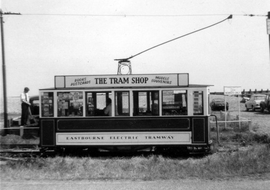 The tram we see in this black and white image is the Mobile Shop, numbered 01. Having been built in 1960 as a flat bed works truck (with Boat Car 226 providing the chassis) this tram was rebuilt into the condition seen here in 1965 – the year this photo was taken – to provide a more secure shop which could be taken back to the safety of the depot each night. In the following 53 years the tram has come full circle as following conversion to use by the works team and then a stint as a refreshment car it is now in use as a ticket office at Riverside Depot during the redevelopment of the Seaton terminus.