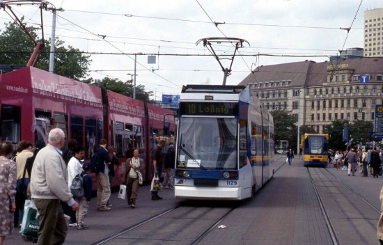 The tram we see in this shot is 1129 which was built by Duewag as part of a batch constructed between 1994 and 1998. It is at the busy stop outside the main railway station with a route 10 service to Lossnig. The date is 23rd May 2003.