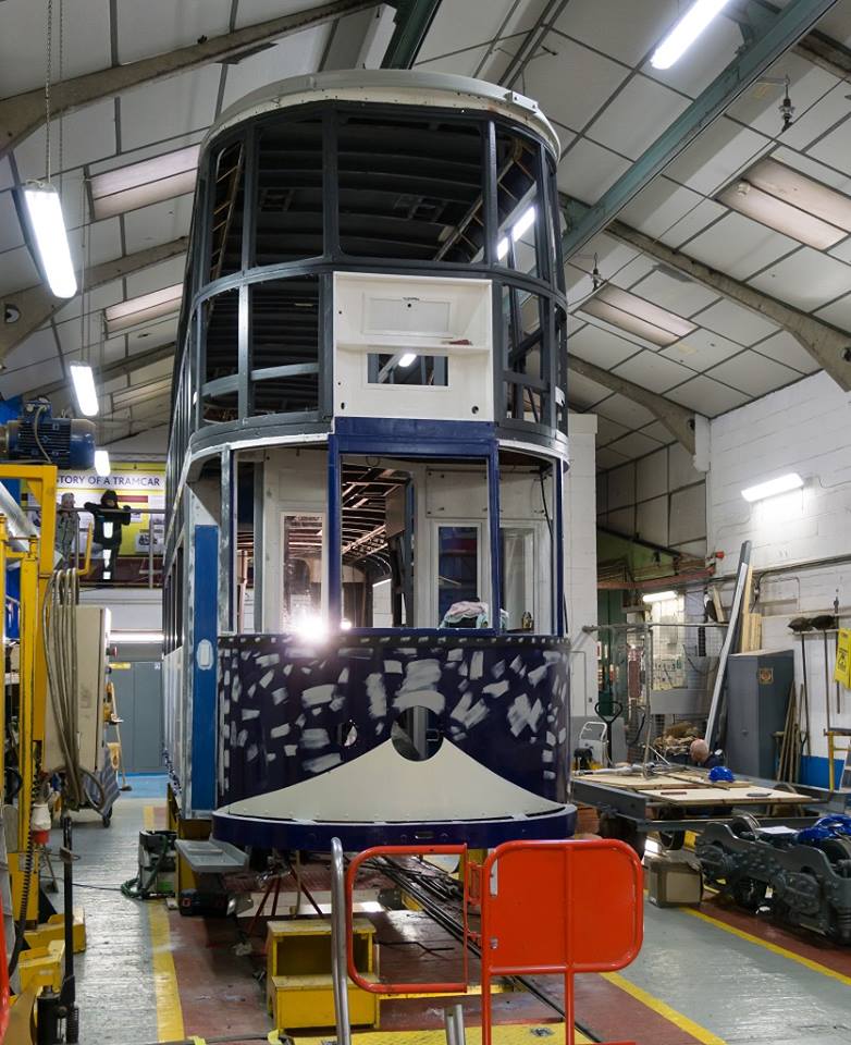 The car body is now at an advanced stage with early traces of the striking blue and white livery now evident, particularly on the dash panels, offering an early glimpse of how the completed tram will look. Filler continues to be applied to the north end dash ahead of more layers of paint being added. Internally, assembly of the cab partitions and bulkhead panels has now been carried out. Finally, the bogies have been rebuilt and were recently moved to a new position alongside the tramcar itself. It is hoped that they will soon be back under the car, which will then be much easier to move around. It is anticipated that this will allow London Transport 1622, another past beneficiary of LCCTT support, to be lifted for a heavy overhaul of its own trucks. The result should be that five London trams will be operational at Crich in the next few years, an all-time record for the museum which will no doubt create some memorable sights and is sure to be a cause for great celebration!