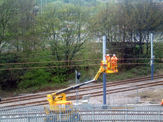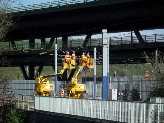 A major milestone in the construction work required for Tram-Train services to start later this year was reached over the weekend with overhead wires now in place connecting the current South Yorkshire Supertram system with Network Rail metals at Tinsley Junction. Supertram services were suspended from Friday 20th April until Sunday 22nd April to allow the work – and rail replacement work at Attercliffe – which was actually a day shorter than planned with all the work taking less time than expected – its nice to report on engineering work being finished early!