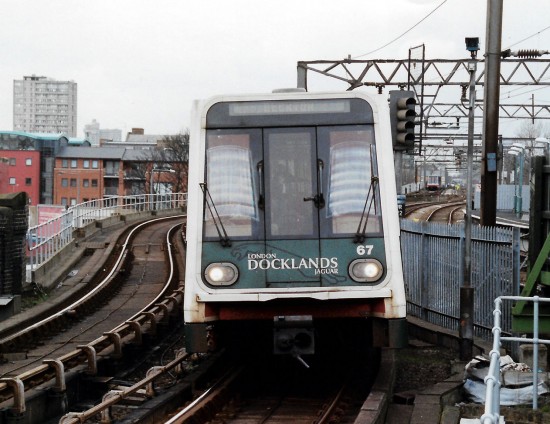 This photo shows B92 67 (which is partnered out of shot by B2K 93) just as it approaches the platform at Limehouse on 12th March 2003. Rather than carrying the standard Red, White and Blue livery 67 has had an all over advert applied for London Docklands Jaguar – a livery it would carry for a couple of years. At the start of the 21st century it wasn’t uncommon for DLR units to receive adverts but in more recent times it has been very much the exception to the rule. In the background we can also see another DLR service heading off to either Bank or Tower Gateway. The tracks to the right are from the main line railway out of Fenchurch Street.