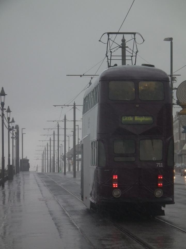 The atrocious weather conditions which greeted 711 on its first day back in service can clearly be appreciated in this view of the tram heading along North Promenade. (Photo by Steve Kemp)