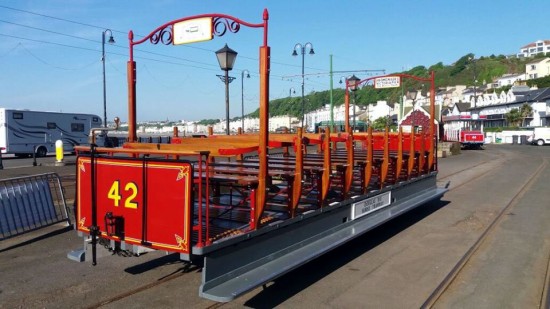 Douglas Bay Horse Tramway Toastrack 42 is back in service following the completion of its major overhaul/refurbishment at the Manx Electric Railway’s Derby Castle shed. It ran in service for the first time on Wednesday 30th May showing off its new paintjob in the more traditional red and yellow colour scheme instead of the previous red and blue scheme.