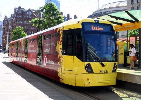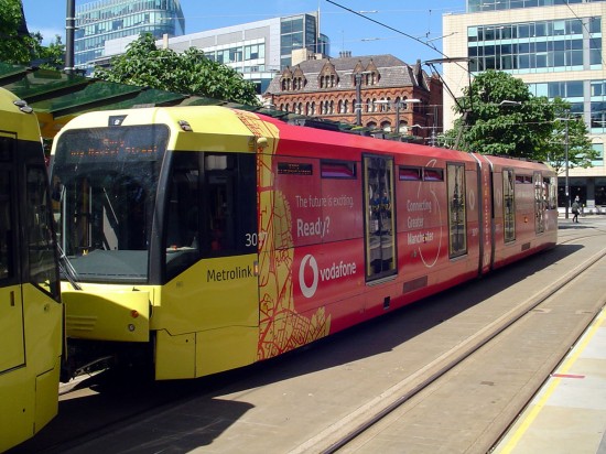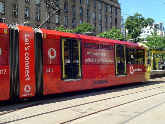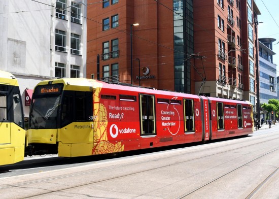 At the end of last week we reported on how a new deal would see four tram covered in vinyl wraps for Vodafone on Manchester Metrolink but that isn’t all as a new advert has also been revealed for Heart FM. All five new adverts (only three of the Vodafone trams have been spotted so far but the deal is for four) are red based and feature full contravision on passenger windows.