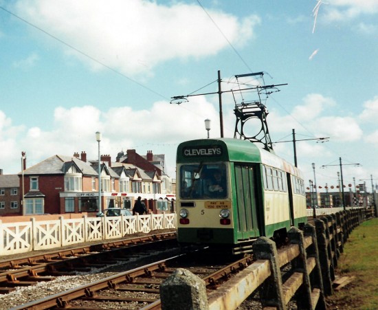 The tram in question is OMO 5 which is seen having just departed from the stop at Cavendish Road and is now on the approach to Bispham on a summer’s day in August 1992. The tram is running through to Cleveleys and is not running one man operated as the conductor can be seen standing alongside the driver at the front. 5 was in the pretty standard green and cream livery at this point.