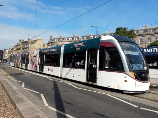 It was obviously only going to be a matter of time but all 27 trams in Edinburgh now have external adverts in the standard pattern of full height vinyls of the third and fifth section and above window ads on the remainder of the tram. The last to succumb is 264 which has received an advert for Edinburgh Park and the Edinburgh Festival Fringe.