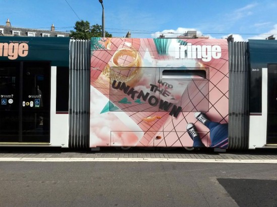 * It has now been confirmed that this advert on the tram is part of a partnership that aims to promote culture across the city of Edinburgh and beyond. As part of this partnership Parabola have the rights for six trams – they currently have adverts on three and with no others currently free they will have to wait for a while for any additional adverts!