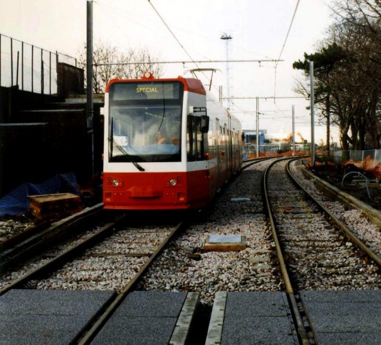 This photo was taken in 1999 ahead of the opening of the Croydon Tramlink system – bringing trams back to the streets of London for the first time since 1952 – and shows an unidentified tram on a test run. Construction work is still ongoing around the tram with the first public services not to follow until 2000 so there is plenty of time for the work to be completed. As well as being unnumbered the tram is also in a clean and bright fleet livery of Red and White.