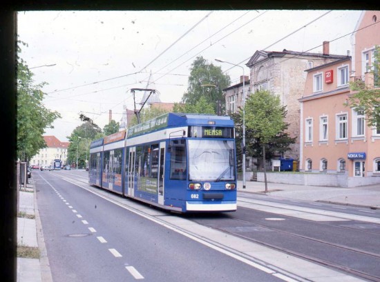It is route 2 which we see here with 682 running along Richard Wagner Strasse with a service to Mensa. This tram was from a batch built by Duewag in 1994/5 and is partly low floor.