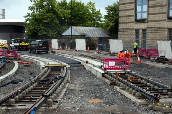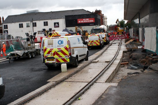 Work to extend the West Midlands Metro at both ends of the current line is currently continuing at a pace. At the Wolverhampton end of the line there is a hive of activity with plenty of tracklaying in progress on Piper’s Row as these photos from Martin Miller depict.