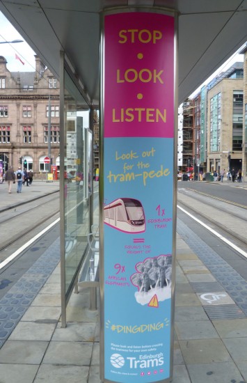 Did you know that one Edinburgh tram equals the weight of nine African Elephants? No, well you do now! As part of a new safety campaign in the Scottish capital pedestrians are being encouraged to “Look out for the tram-pede” with posters being added to tram stops.