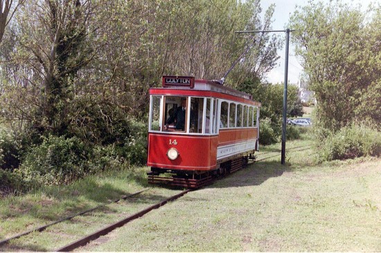 The tram shown here is 14 in the Seaton Tramway fleet which is one of three trams which has been converted for use on the 2’9” gauge tramway from an original first generation tram. In this case 14 started off life as Metropolitan Electric Tramways 94 (renumbered as 2455 upon takeover by London Transport) which was a double deck open topper built in 1904 and withdrawn in 1935. A group of enthusiasts initially started work on restoring the tram to its original condition with the tram body transferred to Eastbourne in 1961 for work to start. However, progress was slow and in 1968 ownership transferred to Modern Electric Tramways. The decision was then taken to convert the tram into a single deck saloon for operation at Seaton – the first of the conversions to take place. Entering service on 2nd June 1984 14 has remained part of the operating fleet ever since.