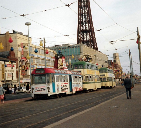 678 is actually at the back of a queue of three trams, at a time when there was no problem of trams pulling up right behind the one in front of the mainline. 678 is carrying a plain, simple but effective all over advert for Auto Trader which by the time this image was captured in August 1992 was in the latter stages of its life (it would be removed later the same year). The Ex-Towing Railcoach – now part of the Fleetwood Heritage Leisure Trust collection at Wyre Dock – was withdrawn from service in October 2006.