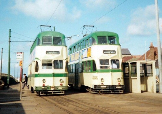 The two Balloon Cars seen here are 719 (on the left) and 709 – two trams which remain in Blackpool to this day but have both been modified to become part of the B fleet with widened entrances. 719 has just terminated with a service from the south and the rear destination blind seems to have already been changed for a return trip to Pleasure Beach. As for 709 it is on the southbound line and will also be heading to Pleasure Beach.