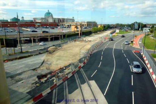 We have now moved along to the western end of Village Way and this photograph shows track at Park Way stop. The track is fully embedded and most of the platform structure is in place as at Village stop.