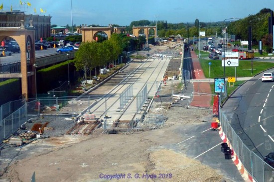 We have now moved down onto Trafford Wharf Road at Wharfside stop where tracklaying has just started and the first section of track is visible.