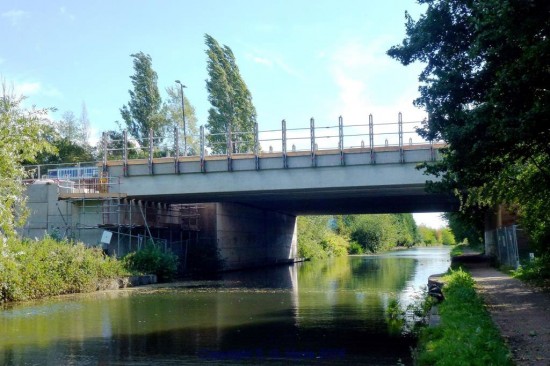 We are now on the tow path of the Bridge water Canal under Park Way are looking at the newly installed bridge beams over the canal.