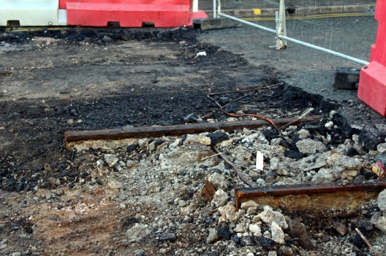 Work to extend the Blackpool Tramway the short distance up Talbot Road to Blackpool North Railway Station is continuing with the first new track now in situ although there is also still evidence of some of the old tram track which has been uncovered in preparing the surface for the laying of new track. The below photos show the situation as at Monday 24th September.
