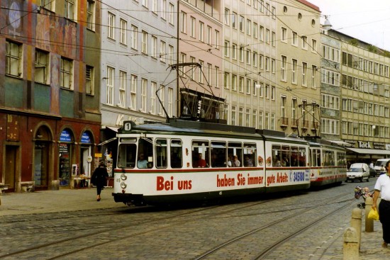 The tram at the front of this photo is an ex-Stuggart GT4 built by Maschinefabrik Esslingen and numbered 415. This tram was built in 1962 and was transferred to Augbsurg in 1995 but its life in the Bavarian city wasn’t to last long with it being sold on to Iasi in Romania at the end of 2009 where it currently remains in service. In this view it is partnered with another unidentified tram.